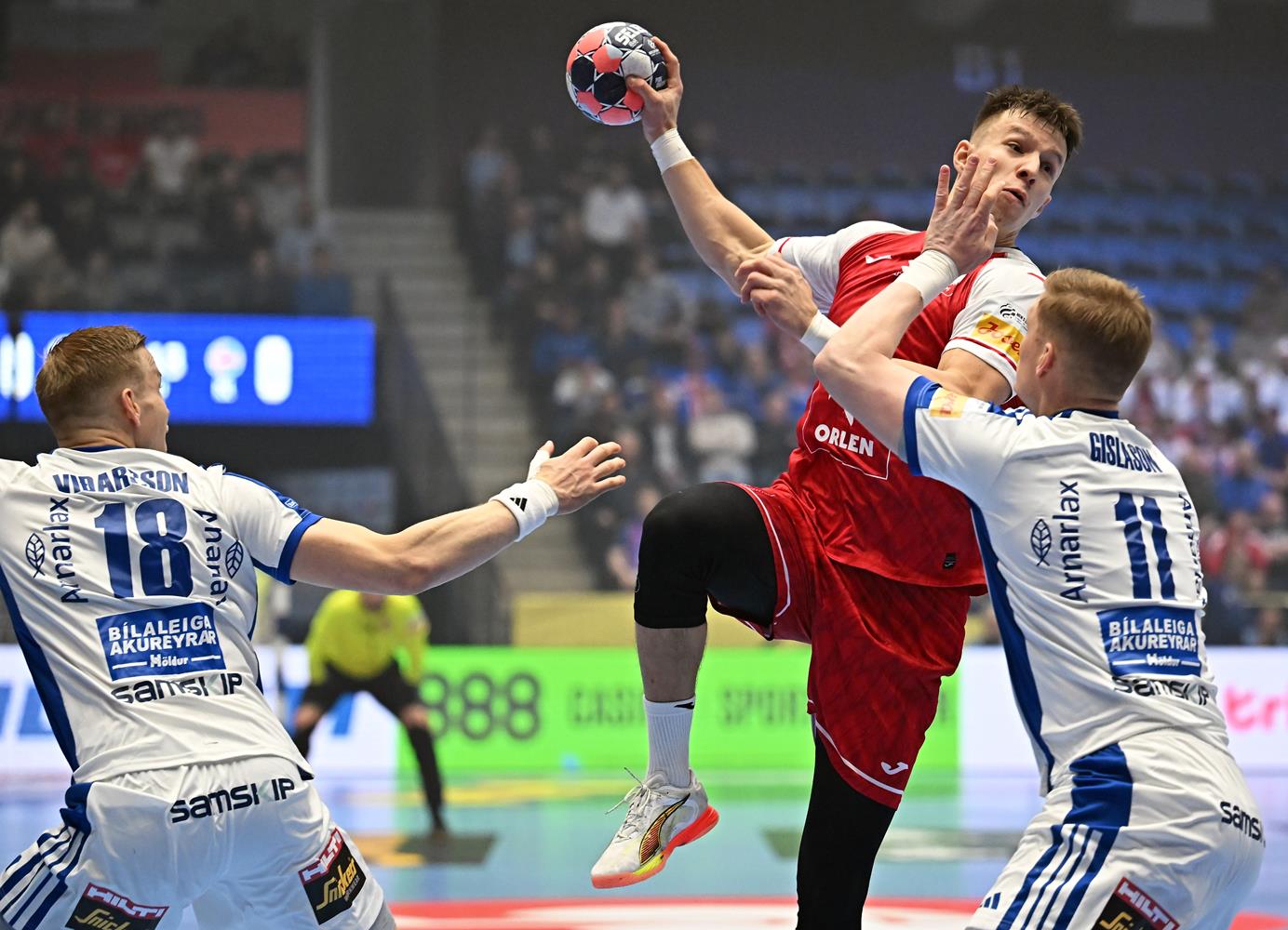Polacy grali bez kompleksów. Często podejmowali ryzyko, przez co popełnili kilka błędów, ale odważne akcje pozwalały im prowadzić wyrównaną grę z faworytami z Islandii. W 10. minucie Maciej Gębala trafił na 5:4. Ambitna i konsekwentna postawa naszego zespołu wyraźnie wybiła rywali z rytmu, bo oni także zanotowali kilka bardzo prostych strat. Mocnym punktem w naszym zespole był również Miłosz Wałach (6 interwencji do przerwy).